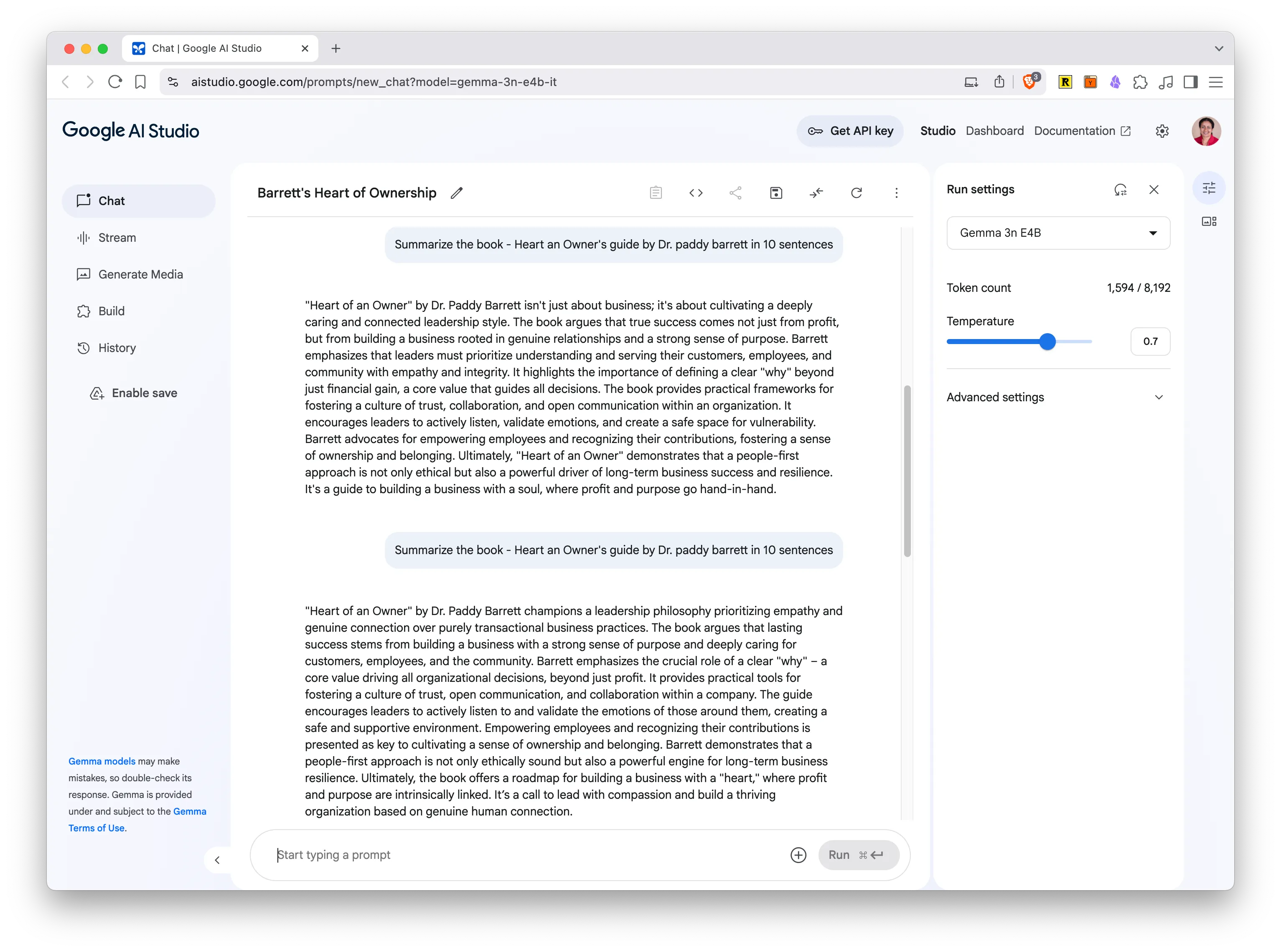 - Running Gemma in Google AI Studio