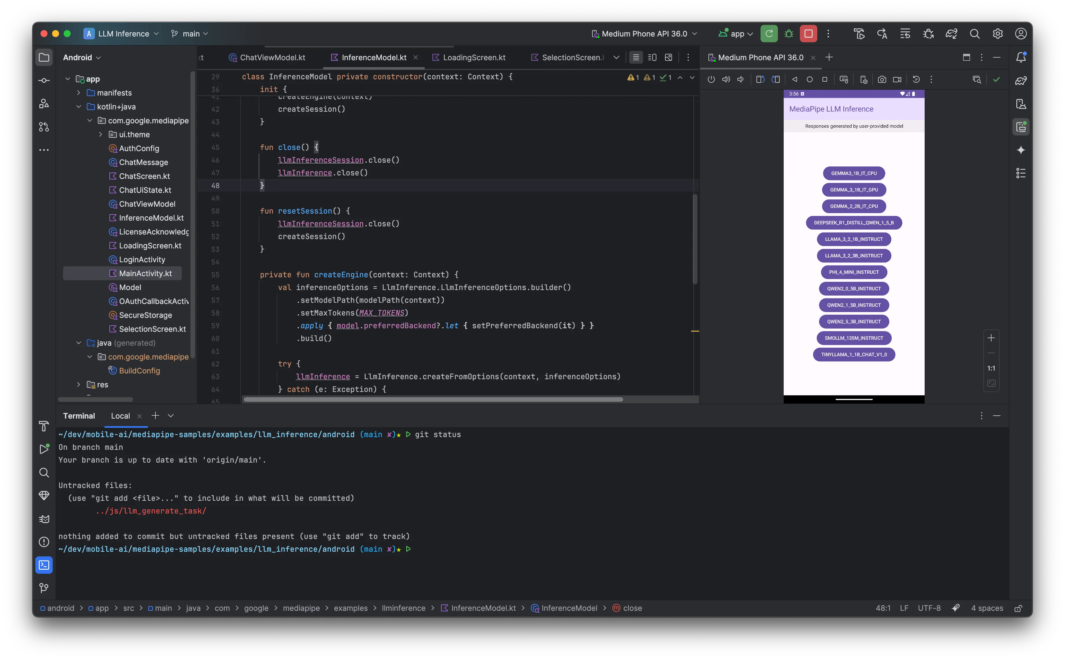 Download a model: For example, download Gemma-2 2B in 8-bit quantized format from Kaggle Models or HuggingFace LiteRT and place it in your project directory.