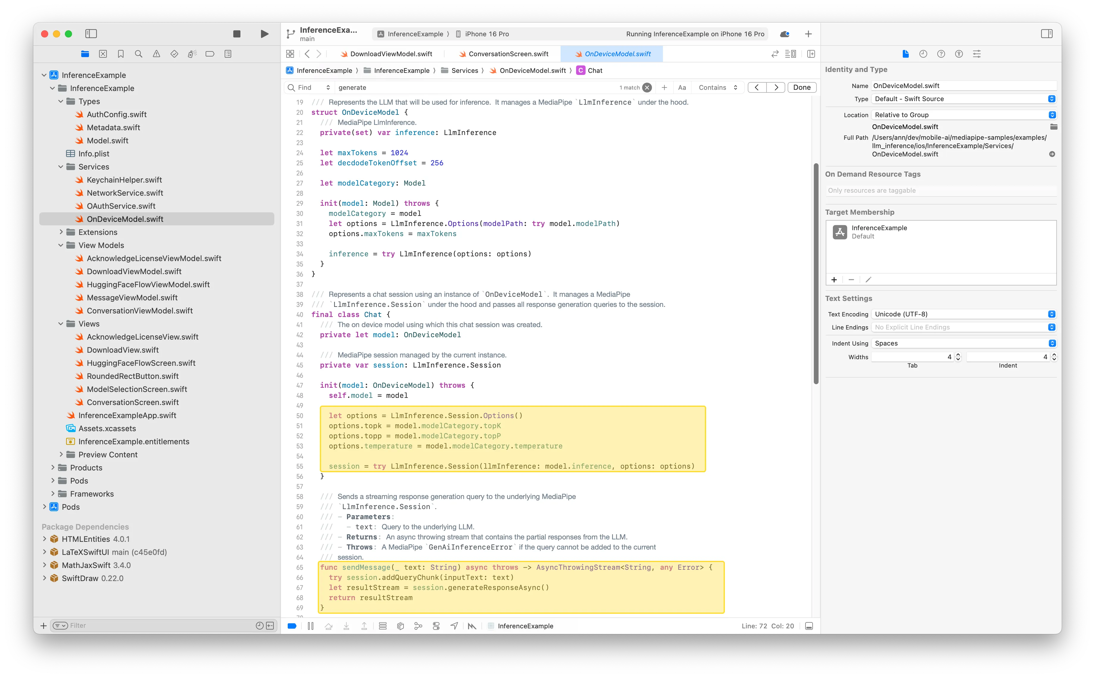 generateResponse(inputText:)method for single responses, orgenerateResponseAsync(inputText:)for streaming: